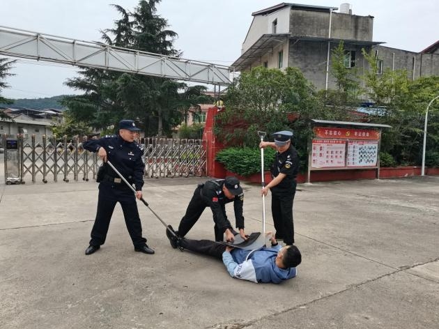 演练结束后,民警向安保人员讲解并现场示范防暴腰叉、盾牌、警棍等防护器材的使用方法。