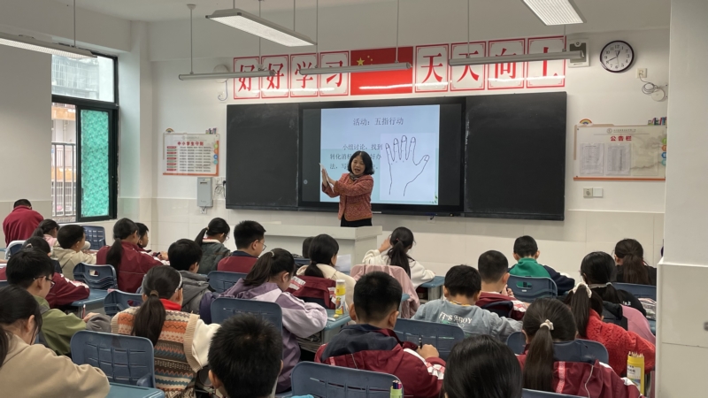 在团辅活动中,岳芙蓉老师巧妙地运用团辅沙龙,引导孩子们认识并表达自己的情绪。她以一个引人入胜的故事开启了“我的情绪我做主”的主题讨论,并通过“五指行动”这一互动游戏,让孩子们掌握情绪管理的实用技巧。在轻松愉悦的氛围中,孩子们学习了如何主宰自己的情绪,为自己的快乐和幸福负责。通过活动不仅增强了孩子们的情绪智力,还为他们的心理和情感发展打下了坚实的基础。