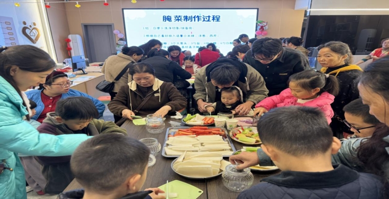 活动从节气知识小课堂开始。志愿者从小雪的历史渊源讲到古人的诗词歌赋,从晒腊肉、吃糍粑、晒鱼干等传统习俗活动讲到传统民间小故事,将节气文化娓娓道来。现场还设置了互动体验环节,小朋友们在家长的陪伴下,开始了一场与腌菜的亲密接触,他们按照志愿者的指导,认真地将蔬菜洗净、切好,然后与家长们一起将它们放入小坛中,一层一层地加上食盐、白糖等调料,再淋上米醋,最后封坛。在整个腌制过程中,小朋友们和家长们时而互相讨论,彼此间的亲子关系得到了进一步的升华。活动最后,大家齐聚一堂,合影留念,记录下美好的瞬间。