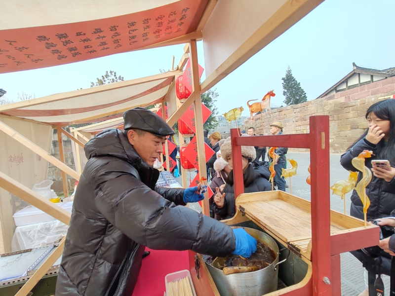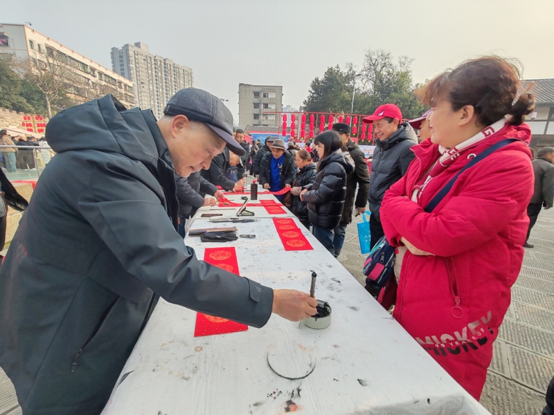 活动当天,潼川古城护城河旁热闹非凡。书法家们现场挥毫泼墨,为市民和游客书写福字与春联,墨香四溢,年味十足。与此同时,“蜀韵三生,春台嗨购”新春购物节也正式拉开帷幕,众多当地名优特产和特色美食吸引了大量游客和居民驻足品尝、选购。当天下午,精彩纷呈的民俗巡游表演在古城内上演,欢快的节奏和精彩的表演赢得了观众的阵阵掌声。