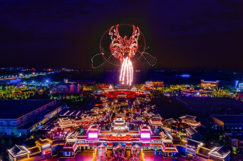 “山海天幕大秀”也是本次活动的一大亮点。在浩瀚夜空下,绵阳方特园区上空千架无人机同时启航,组成“时空之门”和“神龙吐息”等震撼画面,呈现出绚丽的光影变幻。这场大秀不仅是对新年的美好祝福,更是现代科技与传统文化结合的创新尝试,为游客带来一场前所未有的沉浸式体验,让游客感受到浓厚的节日氛围。